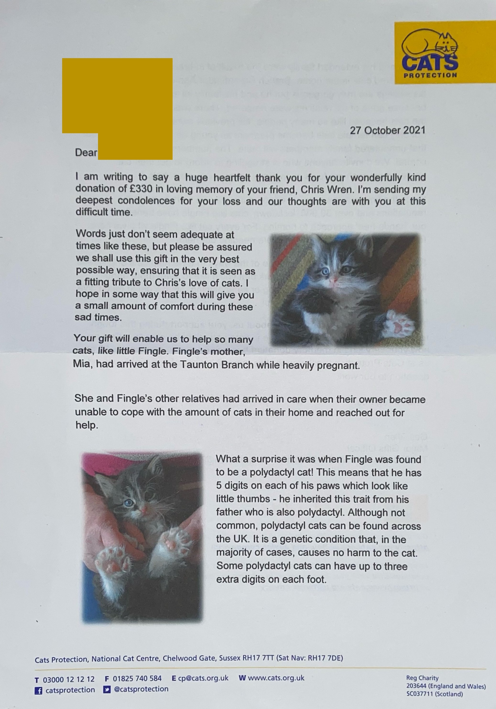 Reg Posted October 24, 2021 Author Report Share Posted October 24, 2021 Good Afternoon All. Today I paid what I believe to be the last bill of 2021 for this site costs. I have brought this forward a little earlier then planned but am delighted to pay the surplus money towards the Cats Protection League in memory of Chris Wren as per this chain. Thank you to everybody that specifically supported the Cats Protection League and this charity for Chris Wren's memory directly and also everybody that has supported the site that created some additional excess money that could also be donated. The Cats Protection League is the official charity of this site from now on and I hope we can do the same in the future. The second post has been edited to show the donation, but I also share this here again. Thank you. Twitter Link 8 4 Link to comment Share on other sites More sharing options...