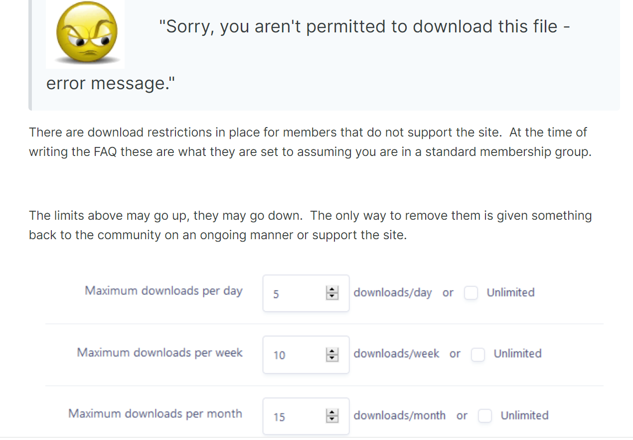 WonkySausage Posted November 1, 2022 Report Share Posted November 1, 2022 (edited) even though you signed up in 2017, you need reputation points (regardless of how long you've been a member) in order to start downloading anything. If you don't donate, you're limited in what you can download every day/week/month Edited November 1, 2022 by WonkySausage 1 Link to comment Share on other sites More sharing options...