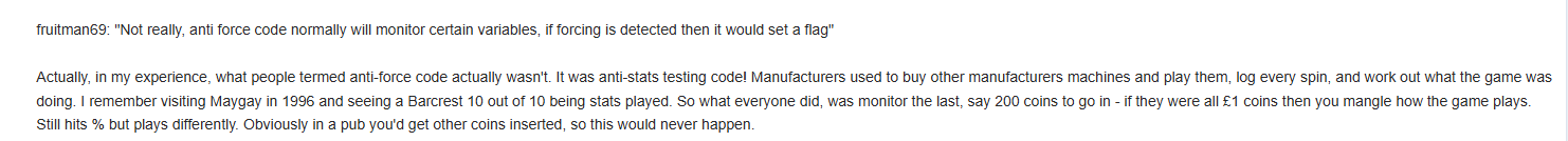 edwardb Posted August 27, 2025 Report Share Posted August 27, 2025 3 hours ago, Hamsun said: I find it hard to believe that putting only £1 coins in would affect the profile. I'm more convinced that playing without a break over a long period, without letting the machine go into attract mode, does have an effect. It might be just imagination but a lot of AWPs did seem to clam up on nudges, features, holds &c when fed rapidly without a break. You are imagining it Remember that most machines from the early 90s onwards were coded on PC and fast-played before the code got near the hardware. PCs have no concept of time spent doing attract modes when you're doing a 100K game stats run.... 1 Link to comment Share on other sites More sharing options...