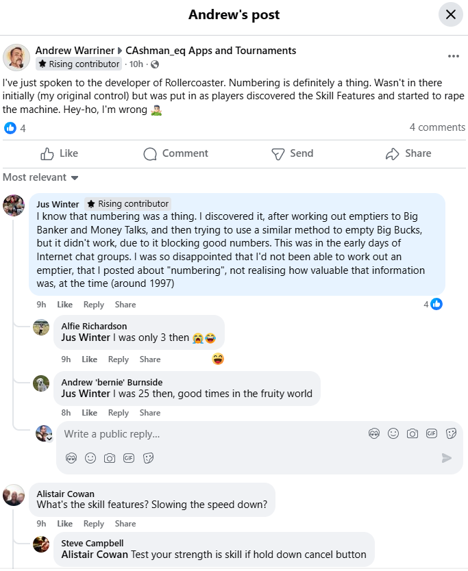 Chopaholic Posted August 3, 2025 Report Share Posted August 3, 2025 Hi Andrew hope you don't mind me cross-posting from the FB group but this seems really interesting and also quite significant. If I'm reading this right, when you originally wrote the code for Roller Coaster (and presumably by extension other games as well), numbering wasn't part of it, but then another developer came along afterwards and specifically made numbering a thing in the code as part of a rechip? Also numbering doesn't stop the skill/good features still being the best ones to collect, it just tells a player who knows about numbering if the machine is going to offer them or not, within about £3-£4 of credits. (i.e. You never need to lose much, for example on the £15 Roller Coaster I had in an arcade here, if I was getting to the end of my credits (I did £5 max) and I hadn't seen a 1/12, I'd collect a Log Flume or suchlike just to get some money back before walking away.) I don't see that another developer coming along and adding numbering to Roller Coaster benefits anyone except the people who know to look out for it? Fruit machine emulation content from the artist previously known as Degsy Degworth and the odd new thing here and there too - https://www.youtube.com/c/DegsyDegworth Link to comment Share on other sites More sharing options...